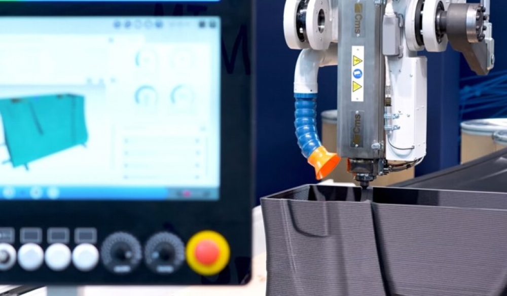 Imprimanta 3D de format mare CMS dispune de o unitate de extrudare cu șurub pentru polimeri termoplastici, capabilă de un debit de material de 30 kg/h.